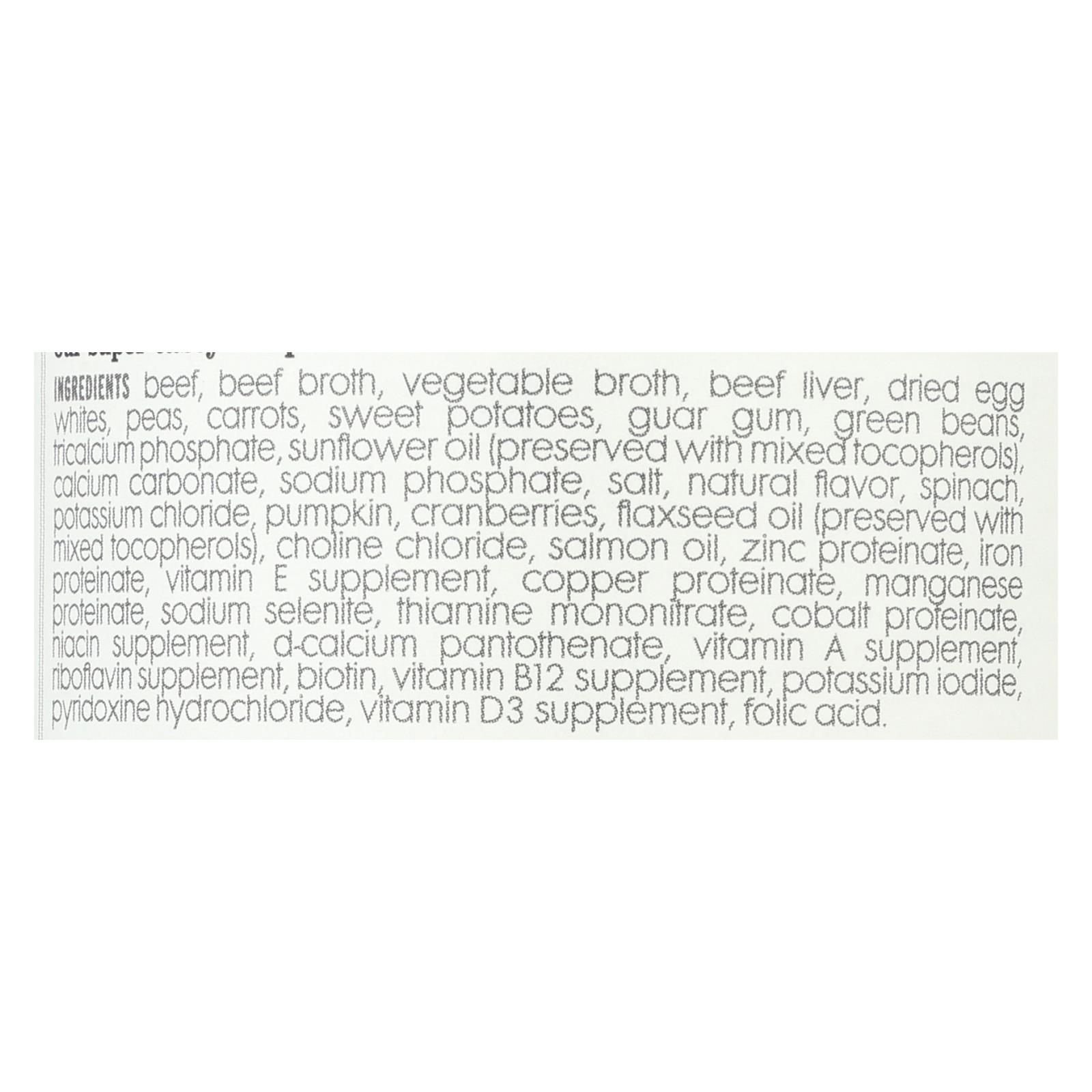 ingredients : beef;beef broth;vegetable broth;beef liver;dried egg whites;carrots;cranberries;dried peas;spinach;sweet potatoes;green beans;guar gum;calcium carbonate;tricalcium phosphate;sodium phosphate;salt;natural flavor;sunflower oil;potassium chloride;pumpkin;salmon oil;preserved with mixed tocopherols;choline chloride;flaxseed oil;zinc proteinate;iron proteinate;vitamin e supplement;copper proteinate;manganese proteinate;sodium selenite;thiamine mononitrate;cobalt proteinate;niacin supplement;d-calcium
