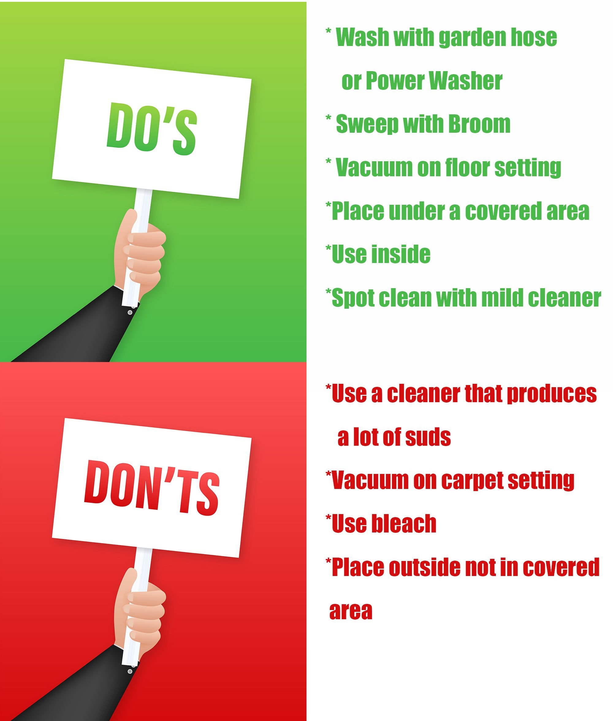 3.Easy to Clean: Maintenance is a breeze - simply rinse with a garden hose or use a power washer to eliminate dirt. No suds-producing cleaners necessary. Alternatively, vacuum on floor setting for indoor cleaning.