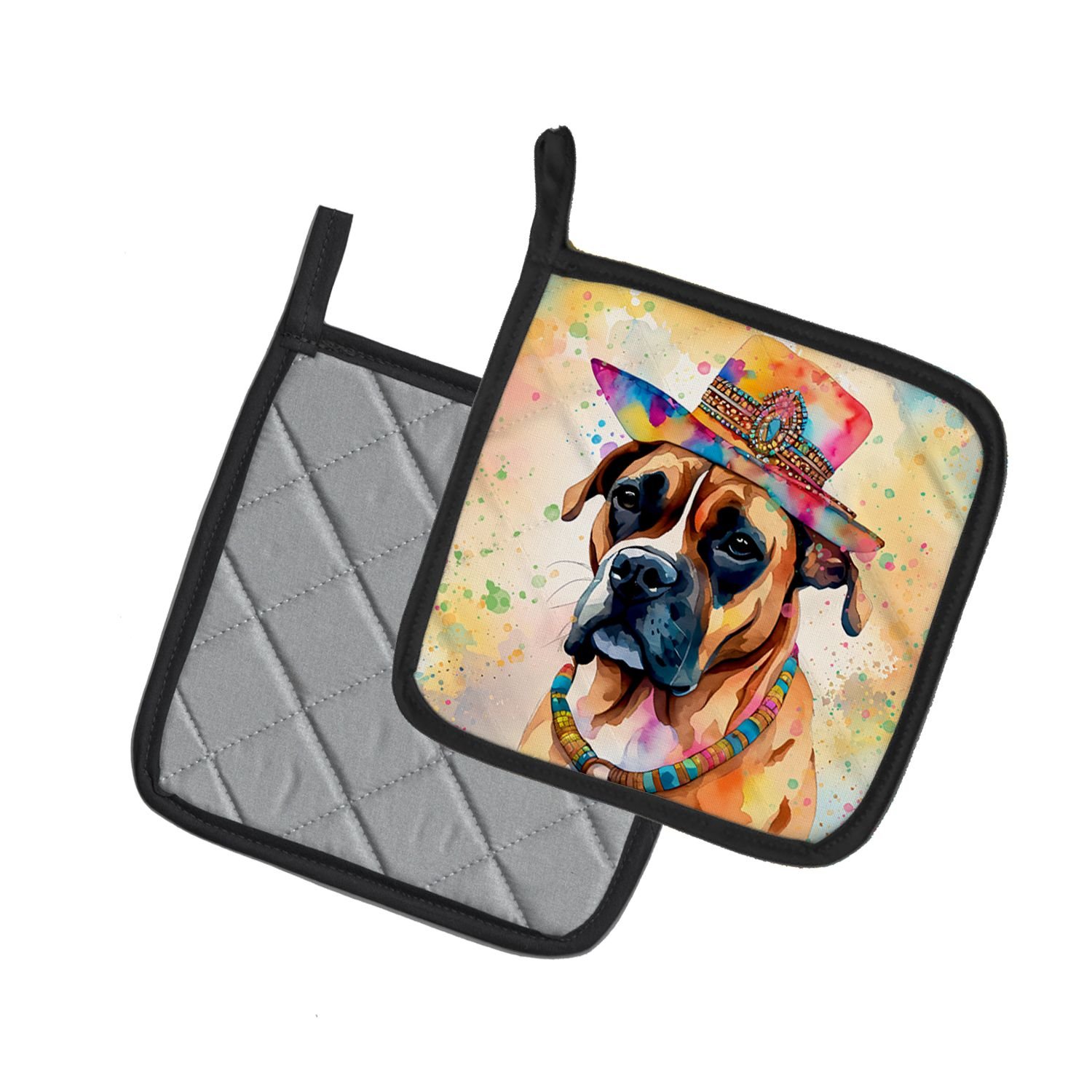 Pair of Pot Holders featuring breed specific Boxer artwork. A Pair of Pot Holders to match your kitchen decor. Made in the USA these are thick and functional. Full color artwork decorates the front polyester fabric of the hot pad and accented by a black trim. Use these at as a trivet for your Thanksgiving or Christmas tablescape. Filled with insulated fabric and quilted for durability. These colorful pot holders will make a great gift for your favorite home cook or executive chef. Each pot holder measures approximately 7 1/2 inches by 7 1/2 inches. A hanging tab is included.