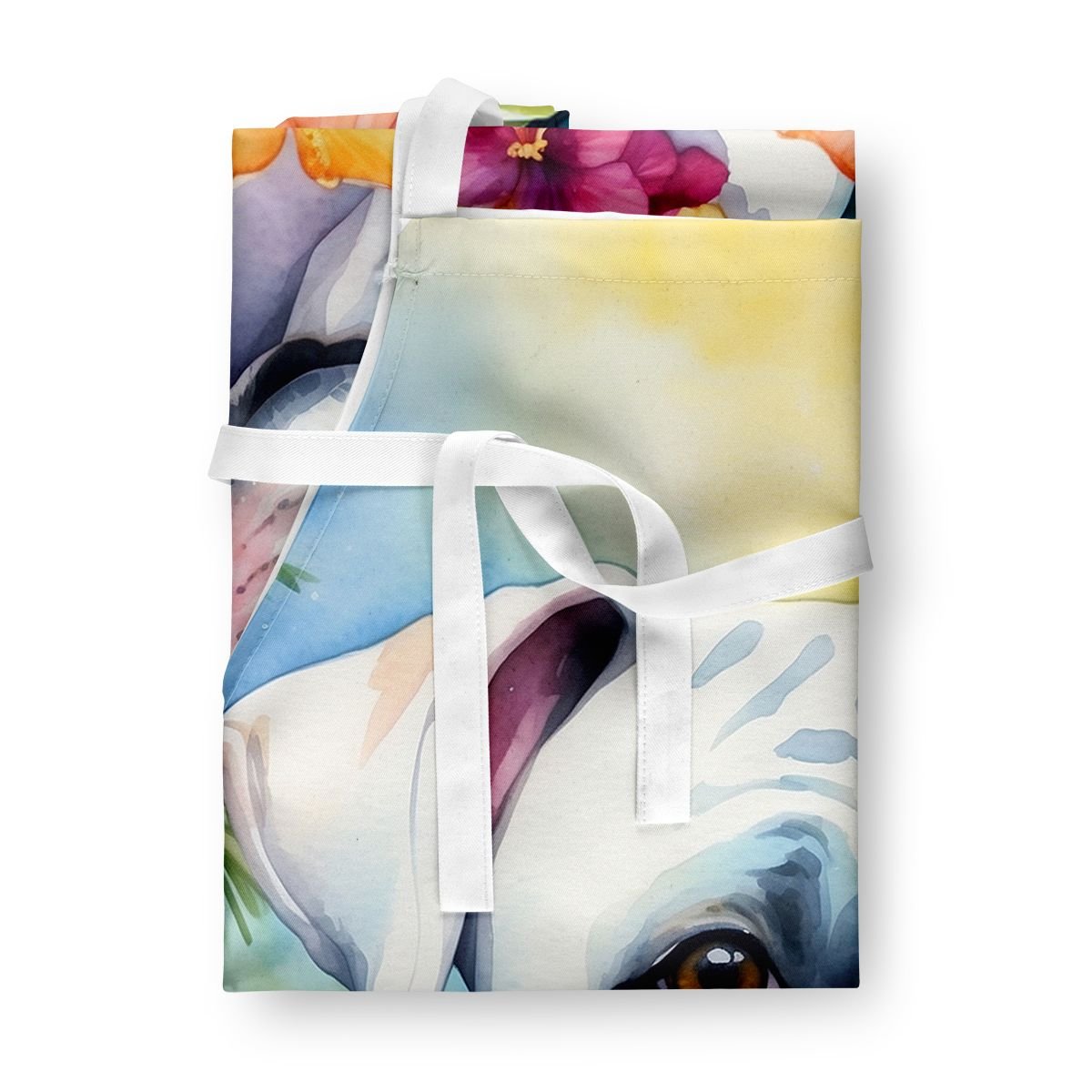 Apron featuring breed specific Boxer artwork. Elevate your cooking, baking, and grilling experiences with our versatile Kitchen or BBQ Apron. This Bib Style apron isn't just limited to culinary activities - it also serves as an excellent baking apron, artist apron, server apron, gardening apron, or even a dog grooming apron. The apron showcases vibrant full-color artwork contributed by one of our talented artists, bringing a dash of style to your daily tasks. With dimensions of approximately 27"W x 30"H, it provides ample coverage to protect your clothing from spills and splashes. Our apron is meticulously crafted from 100% Ultra Spun Polyester, known for its durability and lightweight nature. The apron comes with white tie straps, ensuring a comfortable and adjustable fit for all. It's a perfect choice for kitchen apron enthusiasts, whether you are a woman or a man. Designed for easy maintenance, this apron is fully machine washable. The quick-drying polyester material actively reduces staining, keeping your apron looking fresh and new for longer. Our beautifully designed apron isn't just a functional kitchen accessory - it's a fashion statement in the culinary world!