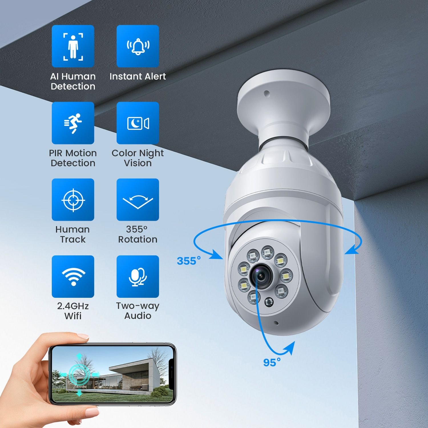 Home > 2.4Ghz Light Bulb Security Camera; Human Detection And Track; Color Night Vision; Instant Alert; 1080P Wireless Wi-Fi Smart Home Security Cameras; Wi