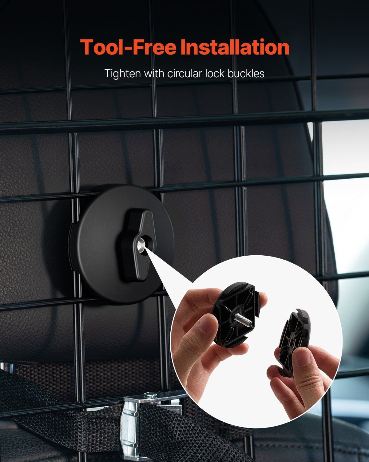 3.Tool-Free Installation: Our dog car barrier comes with circular locks, nylon straps, and elastic cords for secure attachment to the headrests. It requires no tools for installation, ensuring easy setup and a firm, slip-resistant hold.
