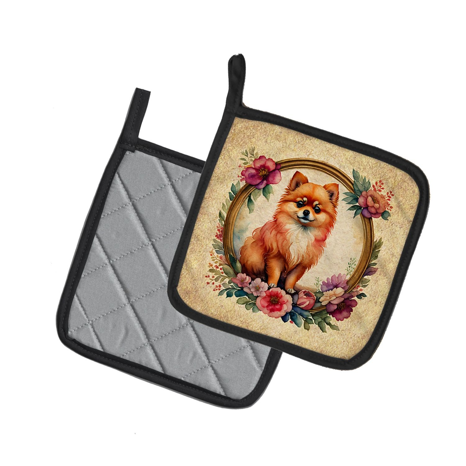 Pomeranian and Flowers Pair of Pot Holders Kitchen Heat Resistant Pot Holders Sets Oven Hot Pads for Cooking Baking BBQ, 7 1/2 x 7 1/2